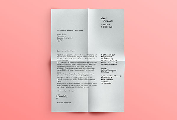 Graf-Jurowski ist ein Wäschegeschäft in Nürnberg. Während meiner Arbeit bei Greige habe ich das Logo und die neuen Printmedien erarbeitet.